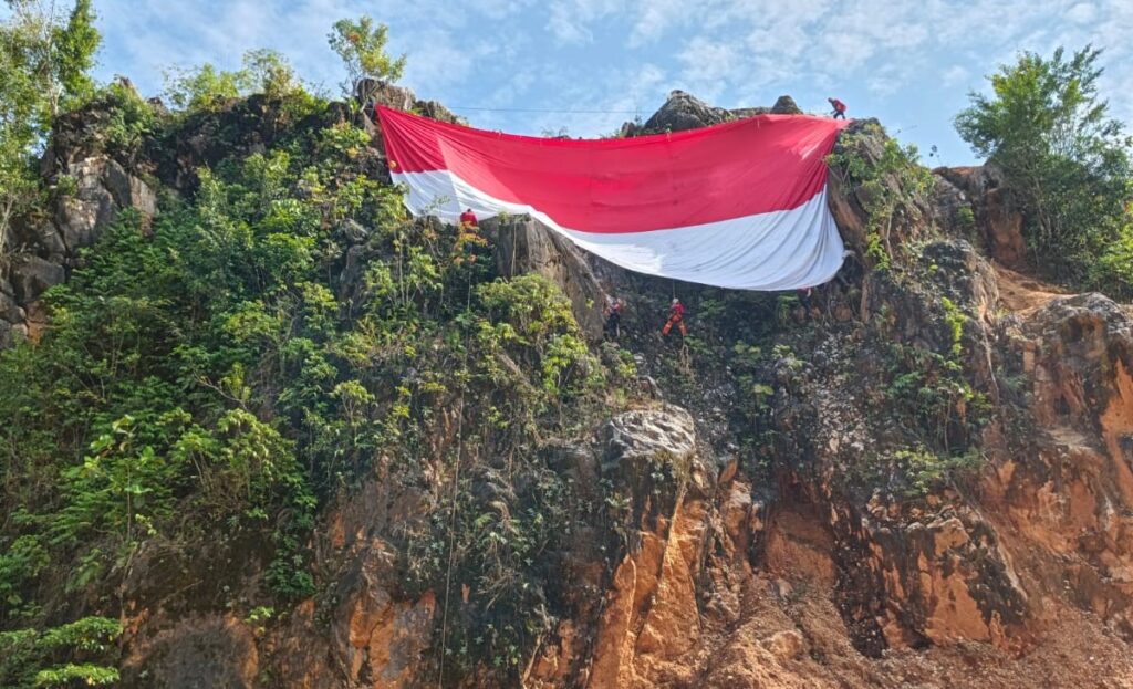 Bendera Raksasa Berukuran 20 x 10 Meter Dibentangkan Pada Tebing Gunung Di Kecamatan Jaro Tabalong